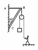 如图所示,一轻质三角形框架的B处悬挂一个定滑轮(质量忽略不计)。一体重为500牛的人通过跨定滑传输线的轻绳匀速提起一重为300牛的物体。