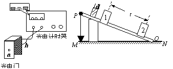 16、像打点计时器一样,光电计时器也是一种研究物体运动情况的常用计时仪器,其结构如上图所示,a、b分别是光电门的激光发射和接收装置,当有物体从a、b间通过时,光电计时器就可以显示物体的挡光时间。现利用上图所示装置测量滑块和长lm左右的木块间的动摩擦因数,图中MQ是水平桌面,Q是木板与桌面的接触点,1和2是固定在木板上适当位置的两个光电门,与之连接的两个光电计时器没有画出。此外在木板顶端的P点还悬挂着一个铅锤,让滑块从木板的顶端滑下,光电门l、2各自连接的计时器显示的挡光时间分别为
