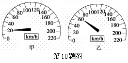 如图所示是汽车的速度计,某同学在汽车中观察速度计指针位置的变化。开始时指针指示在如图甲所示位置,经过8 s后指针指示在如图乙所示位置,若汽车做匀变速直线运动,那么它的加速度约为( )