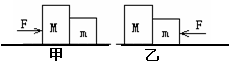 10、如图甲、乙所示,质量分别为M和m的两物体靠在一起放在光滑水平面上.用水平推力F向右推M,两物体一起向右加速运动时,M、m间的作用力为N1;用水平力F向左推m,使M、m一起向左加速运动时,M、m间的作用力为N2,则( )
