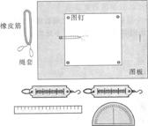 在“探究合力与两个分力的关系”的实验中,实验器材如图所示。实验时图板水平放置,用两只弹簧秤分别挂在细绳套,互成角度地拉橡皮条,使它伸长到某一位置O点静止。此时,必须记录的是(用字母表示)________和_______以及_________。