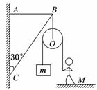 16.(14分) 如图所示,轻杆BC的C点用光滑铰链与墙壁固定,杆的B点通过水平细绳AB使杆与竖直墙壁保持30°的夹角.若在B点悬挂一个定滑轮(不计重力),某人用它提起重物,使重物以加速度2m/s2向上做匀加速运动.已知重物的质量 m=10 kg,人的质量M=50kg,g取10 m/s2.试求:
