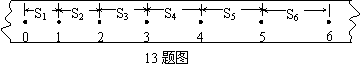 14、在做《研究匀变速直线运动》的实验时,某同学得到一条纸带,如图所示,并且每隔四个计时点取一个计数点,已知每两个计数点间的距离为S,且S1=0.96cm,S2=2.88cm,S3=4.80cm,S4=6.72cm,S5=8.64cm,S6=10.56cm,电磁打点计时器的电源频率为50Hz。计算此纸带的加速度大小a= m/s2,打第4号计数点时纸带的速度大小V=______ m/s。