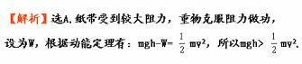 [解析]选D.由于纸带与打点计时器之间的摩擦力及空气阻力的作用,重物下落的加速度a小于重力加速度g,所以v<gt,故D正确.