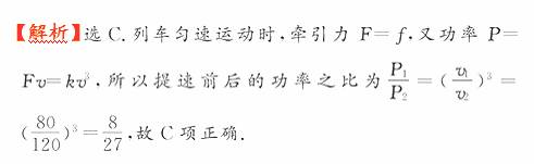 1.列车提速的一个关键技术问题是提高机车发动机的功率.已知匀速运动时,列车所受阻力与速度的平方成正比,即f=kv2.设提速前速度为80 km/h,提速后速度为120 km/h,则提速前与提速后机车发动机的功率之比为( )