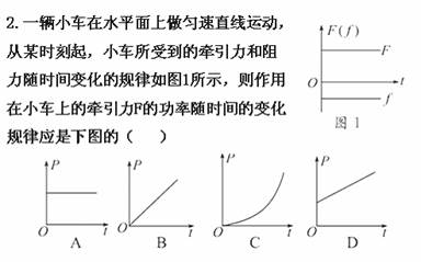 [解析]选D.设小车的质量为m,则F-f=ma,小车的速度v=at,F的功率为P=Fv=Fat=F(F-f)t/m,由此得P∝t.又因初始时刻P≠0故B项错,D项正确.