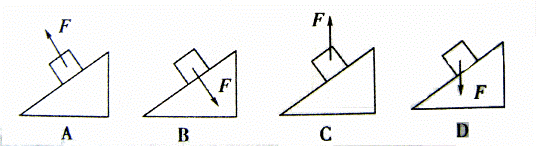 9.物块静止在固定的斜面上,分别按如图所示方向对物块施加大小相等的力F,A中F垂直斜面向上,B中F垂直于斜面向下,C中F竖直向上,D中F竖直向下,施力后物块仍然静止,则物块所受静摩擦力增大的是