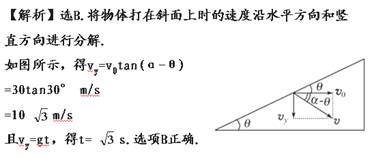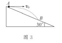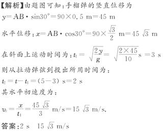 7.(2010·嘉兴高一检测)(10分)如图3所示,某部队官兵在倾角为30°山坡上进行投掷手榴弹训练,若从A点以某一初速度v0沿水平方向投出手榴弹,正好落在B点,测得AB=90 m.(空气阻力不计),求如手榴弹从拉动弹弦到爆炸需要5 s的时间,若要求手榴弹正好在落地时爆炸,问:战士从拉动弹弦到投出所用时间是多少?手榴弹抛出的初速度是多少?(g=10 m/s2)