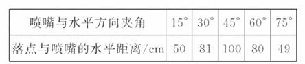 10.王兴被选为铅球运动员参加运动会,在赛前训练中,他把铅球以一定的速度向斜上方抛出去,铅球的运动为斜抛运动,他想,以多大的抛射角才能将铅球推得更远呢?于是他作了如下探究:他用如图5装置进行实验,保持容器水平,将喷水嘴的位置不变,他控制开关保持水喷出的速度大小不变,而让水沿不同的方向喷出,得到以下数据: