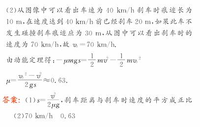 (2)若是发生了车祸,交通警察要根据碰撞后两车的损坏程度(与车子结构相关)、撞后车子的位移及转动情形等来估算碰撞前司机是否刹车及刹车前的车速.若估算出碰撞时车子的速度为40 km/h,碰撞前的刹车痕为20 m,根据图线分析,车子原来的车速是多少?并求出轮胎与地面间的动摩擦因数μ的值.