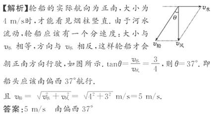 6.(9分)北风速度为4 m/s,大河中的水流正以3 m/s的速度向东流动,船上的乘客看见轮船烟囱冒出的烟柱是竖直的,求轮船相对于水的航行速度为多大?什么方向?
