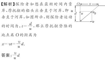 7.(2010·长春高一检测)(10分)在一次漂流探险中,探险者驾驶摩托艇想上岸休息,江岸是平直的,江水沿江向下流速为v,摩托艇在静水中航速为u,探险者离岸最近点O的距离为d.如果探险者想在最短的时间内靠岸,则摩托艇登陆的地点离O的距离为多少?
