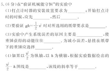 6.(4分)在“验证机械能守恒定律”的实验中有如下可供选择的器材:铁架台、电磁打点计时器、复写纸、纸带、低压直流电源、天平、秒表、导线、开关.其中不必要的器材是_________,缺少的器材是________.