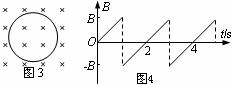 3.一环形线圈放在匀强磁场中,设第1s内磁感线垂直线圈平面(即垂直于纸面)向里,如图所示。若磁感应强度B随时间t变化的关系如图4所示,那么第3s内线圈中感应电流的大小与其各处所受安培力的方向是( )