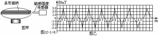 6.某同学在实验室里熟悉各种仪器的使用.他将一条形磁铁放在转盘上,如图甲所示,磁铁可随转盘转动,另将一磁感强度传感器固定在转盘旁边,当转盘(及磁铁)转动时,引起磁感强度测量值周期性地变化,该变化与转盘转动的周期一致.经过操作,该同学在计算机上得到了如图乙所示的图像.