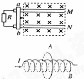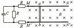 两根光滑的长直金属导轨M N、M′ N′平行置于同一水平面内,导轨间距为l ,电阻不计,M、M′处接有如图所示的电路,电路中各电阻的阻值均为尺,电容器的电容为C。长度也为l 、阻值同为R的金属棒a b垂直于导轨放置,导轨处于磁感应强度为B、方向竖直向下的匀强磁场中。a b在外力作用下向右匀速运动且与导轨保持良好接触,在ab运动距离为s的过程中,整个回路中产生的焦耳热为Q 。求
