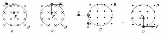 21.洛伦兹力使带电粒子在匀强磁场中做匀速圆周运动,下列各图中均标有带正电荷粒子的运动速度v,洛伦兹力F及磁场B的方向,虚线圆表示粒子的轨迹,其中可能出现的情况是( )