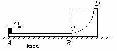 (9分)如图所示,竖直平面内的轨道ABCD由水平轨道AB与光滑的四分之一圆弧轨道CD组成,AB恰与圆弧CD在C点相切,轨道固定在水平面上。一个质量为m的小物块(可视为质点)从轨道的A端以初动能E冲上水平轨道AB,沿着轨道运动,由DC弧滑下后停在水平轨道AB的中点。已知水平轨道AB长为L。求:(注意:图中v0是未知的)