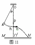 (6分)利用单摆验证小球平抛运动规律,设计方案如图11所示,在悬点O正下方有水平放置的炽热的电热丝P,当悬线摆至电热丝处时能轻易被烧断;MN为水平木板,已知悬线长为L,悬点到木板的距离OO’=h(h>L)。