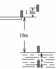 17、跳水运动是我国体育运动的优势项目,某运动员参加10m跳台的跳水比赛,如其质量为m=60kg,其体形可等效为长度L=1.0m,直径d=0.3m的圆柱体,不计空气阻力,运动员站立在跳台上向上跳起到达最高点时,他的重心离跳台台面的高度为1.3m,在从起跳到接触水面过程中完成一系列动作,入水后水的等效阻力F(未包含浮力)作用于圆柱体的下端面,F的数值随入水深度y变化的函数图象如图所示,该直线与F轴相交于F=2.5mg处,与y轴相交于y=h (某一未知深度),已知水的密度ρ=1×103㎏/m3,根据以上的数据进行估算(g取10m/s2)。
