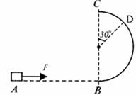 19.水平桌面上水平固定放置一光滑的半圆形挡板BDC,其半径为R=0.6m。一质量m=0.2kg的小物块受水平拉力F作用从A点由静止开始向B点作直线运动,当进入半圆形档板BDC瞬间,撤去拉力F,小物块沿挡板继续运动,并从C点离开,如右图所示(此图为俯视图)。已知BC右侧桌面光滑,左侧桌面与小物块间的动摩擦因数为μ=0.2,A、B间距离为L=1.5m,水平拉力恒为F=1.0N,g=10m/s2。求