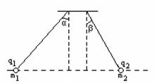 5.如图所示,真空中有两个点电荷q1,q2,它们的质量分别为m1,m2,现在用两根绝缘细丝线拴挂在天花板上,在库仑力作用下两根丝线与竖直方向夹角为α和β,且两点电荷此时处于同一水平线上,则以下说法中正确的是(T1和T2分别为两根丝线的弹力)[ ]