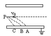 分别将带正电、负电和不带电的三个等质量小球,分别以相同的水平速度由P点射入水平放置的平行金属板间,已知上板带负电,下板接地。三小球分别落在图中A、B、C三点,则 [ ]