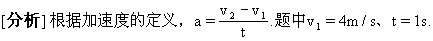 [例8] 一物体作匀变速直线运动,某时刻速度大小为v1 =4m/s,1s后的速度大小变为v2=10m/s,在这1s内物体的加速度大小 [ ]