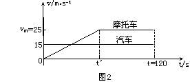 [分析]这里有两个研究对象:汽车和摩托车,.汽车始终做匀速直线运动,摩托车起动后先作匀加速运动,当车速达到其最大值前若还未追上汽车,以后便改以最大车速vm做匀速运动.追上时,两车经历的时间相等.其运动过程如图1所示.