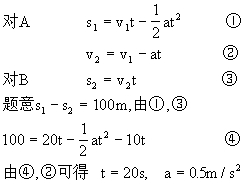 方法四:选B车为参照物,用相对运动解,A相对于B的车速为10m/s,A以a减速,行驶100m“停下”跟B相遇而不相撞。