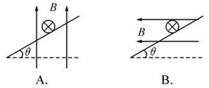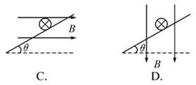 ( )质量为m的通电细杆置于倾角为θ的导轨上,导轨的宽度为d,杆与导轨间的动摩擦因数为μ,有电流通过杆,杆恰好静止于导轨上。如图所示的A、B、C、D四个图中,杆与导轨间的摩擦力一定不为零的是