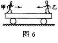 如图6所示,一小车静止在光滑水平面上,甲、乙两人分别站在左右两侧,整个系统原来静止。则当两人同时相向走动时