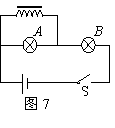 图7中的小灯泡A、B完全相同,带铁心的线圈L的自感系数很大,但电阻可忽略不计,则