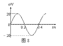 小型交流发电机中,矩形金属线圈在匀强磁场中匀速转动,产生的感应电动势与时间呈正弦函数关系,如图8所示.此线圈与一个R = 9Ω的电阻构成闭合电路,线圈自身的电阻r = 1Ω,下列说法正确的是