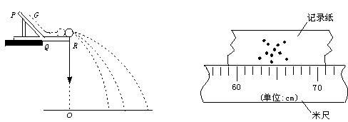 记录纸上,留下痕迹.重复上述操作10次,得到10个落点痕迹。再把B球放在水平槽上靠近槽末端的地方,让A球仍从位置G由静止开始滚下,和B球碰撞后,A、B球分别在记录纸上留下各自的落点痕迹.重复这种操作10次。图甲中O点是水平槽末端R在记录纸上的垂直投影点.B球落点痕迹如图乙所示,其中米尺水平放置,且平行于G、R、O所在的平面,米尺的零点与O点对齐。