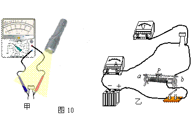 (1)如图10甲所示,某同学想用多用电表研究光敏电阻的光照特性(光敏电阻的阻值与光照强弱的关系)时,应将多用表的选择开关置于合适的___________档;将一光敏电阻接在多用电表两表笔上,先用黑纸包裹着光敏电阻,此时表针指在某一位置;现拆下黑纸,并用手电筒照射光敏电阻,则表针将会向__________(填“左”或“右”)偏转。