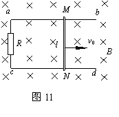 17.(11分)如图11所示,两根电阻忽略不计的平行光滑金属导轨ab、cd置于匀强磁场中,磁场方向垂直纸面向里,两导轨间的距离L=0.6m。电阻R=2Ω,金属杆MN阻值r=1Ω,当用外力F拉着金属杆MN沿两条导轨向右匀速滑动,速度v=10m/s,产生的感应电动势为3V。求: