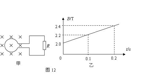 (12分)如图12甲所示,面积为0.2 m2的10匝线圈处在匀强磁场中,磁场方向垂直线圈平面,已知磁感应强度随时间变化规律如图乙所示。电阻R=6Ω,线圈电阻r=4Ω,试求: