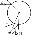 虹是由阳光射入雨滴(视为球形)时,经一次反射和两次折射而产生色散形成的。现有白光束L由图示方向射入雨滴,a、b是经反射和折射后的其中两条出射光线,如图所示。下列说法错误的是
