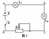 4.如图3所示,电源电动势为4 V,当接通K时,灯L1和L2均不亮,用电压表测得Uab=0,Ubc=0,Ucd=Uad=4 V.由此可知断路处是