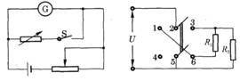 10.如上图右图所示的电路中,电阻R1=R2,外加电压U保持不变,在双刀双掷开关分别掷向3、6位置和掷向1、4位置的两种情况下,电路在单位时间里放出的总热量之比是......( )