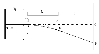 (12分)18.质量为m,带电量为q的粒子,在电势差为U1的加速电场中静止开始运动,然后从A点平行极板方向射入电势差为U2的两块平行极板间的电场中,经电场后从B点射出,沿直线运动,最后打在屏板上P点,如图所示。已知偏转电场两板长L,间距为d,屏板距离两极板S,求P点到中心O点的距离。