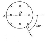 (14分)如图所示,半径为r的圆形区域内存在着垂直纸面向里的匀强磁场,磁感应强度为B。现有一带电离子(不计重力)从A以速度v沿圆形区域的直径射入磁场,已知离子从C点射出磁场的方向间的夹角为60º