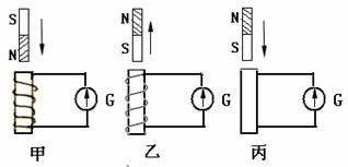 13.(6分).下图为某位同学在做楞茨定律实验时的示意图,三个图示中灵敏电流计的结构和接法完全相同. 当条形磁铁向下插入线圈时, 甲图中灵敏电流计的指针向左偏;当条形磁铁向上拨出线圈时, 乙图中灵敏电流计的指针向___偏;当条形磁铁向下插入线圈时, 丙图中灵敏电流计的指针向右偏,请你把线圈绕向表示在丙图上.