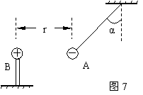 (10分)把质量m=2×10-3kg的带负电小球A,用绝缘细绳悬起,若将带电量为QB=4.0×10-6C的带电球B靠近A,当两个带电小球在同一高度相距r=0.3m时,绳与竖直方向的夹角为α=45°,如图7,试求: