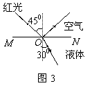 MN是空气与某种液体的分界面.一束红光由空气射到分界面,一部分光线被反射,一部分进入液体中.当入射角是450时,折射角为300,如图3所示.以下判断正确的是
