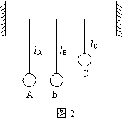 如图2所示,一根张紧的绳上悬挂着质量不同的三个小球A、B、C,其质量大小关系为:MA>MB>MC,悬挂三个小球的摆长的大小关系为:LA=LB>LC 。当A球摆动起来后, B、C球也会摆动起来,稳定后有 ( )