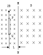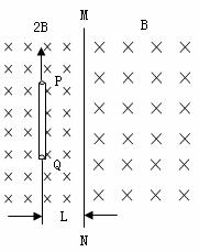 18.(18分)我国科学家在对放射性元素的研究中,进行了如下实验:如图所示,以MN为界,左、右两边分别是磁感应强度为2B和B的匀强磁场,且磁场区域足够大.在距离界线为L处平行于MN固定一光滑的瓷管PQ,开始时一个放射性元素的原子核静止在管口P处,某时刻该原子核发生β衰变,平行于界线的方向放出一个质量为m、带电量为-e的电子,发现电子在分界线处速度方向与界线成60°角进入右边磁场,反冲核在管内做匀速直线运动,当到达管另一端Q点时,刚好又俘获了这个电子而静止.求: