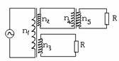 n1:n2=1:2、n1:n3=2:1、n4:n5=4:1,其中n2=n4,两电阻的阻值均为R=11Ω,若电源的输出电压U=220V,则输出电流为( )
