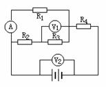 如图,电表均为理想电表,电源电动势E= 4V,电阻R1=4Ω,R2=2Ω,R3=10Ω,R4=6Ω,已知电流表读数为0.3A,求: